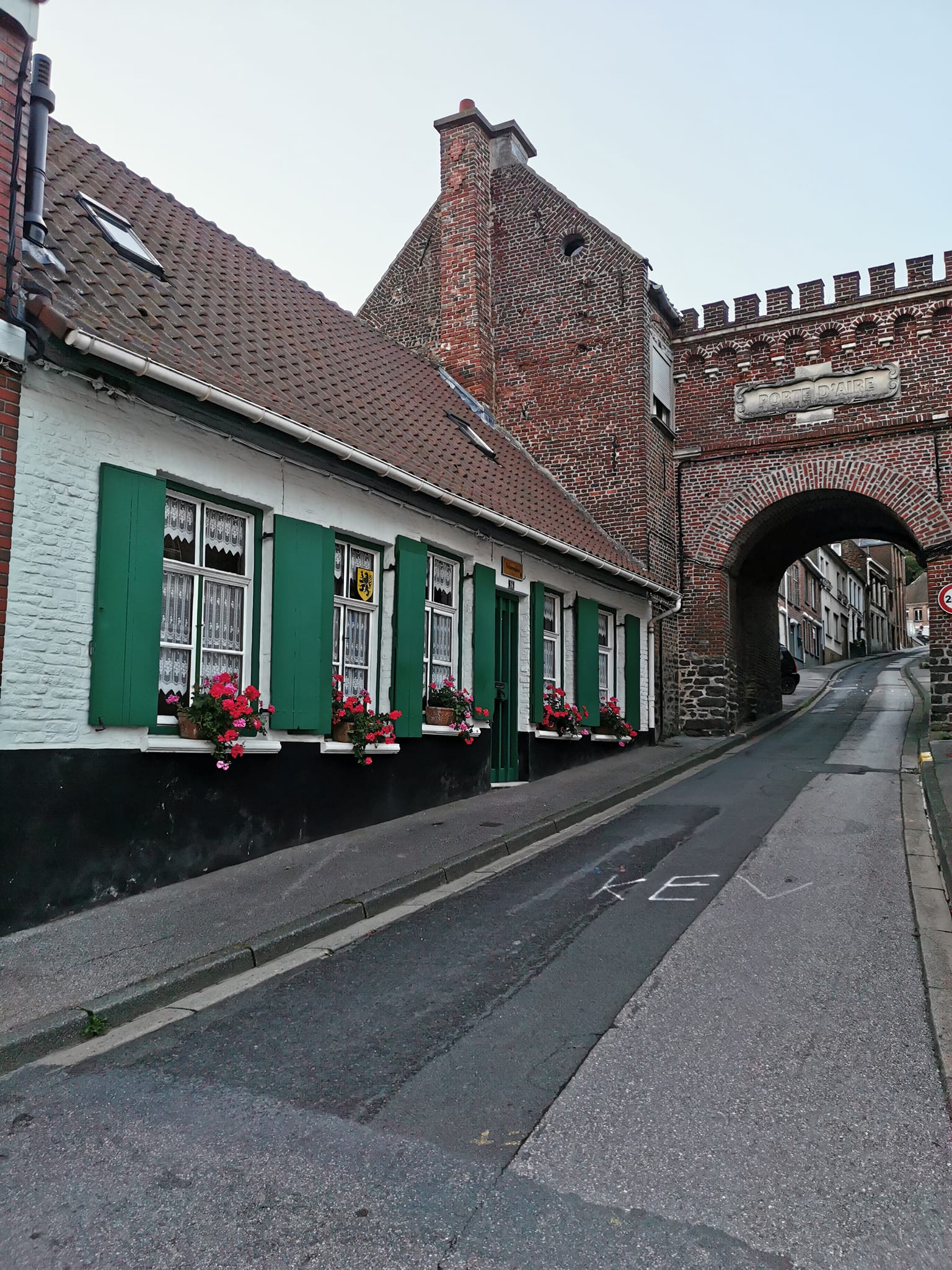 La Porte d’Aire est l’une des portes emblématiques de Cassel, marquant les limites de l’enceinte médiévale du village. Avec sa façade crénelée, son blason gravé et son écriture rouge, elle offre une vue digne d’une carte postale. Passer en courant en dessous (dans le sens de la montée, bien sûr) ajoute une dose d’excitation !